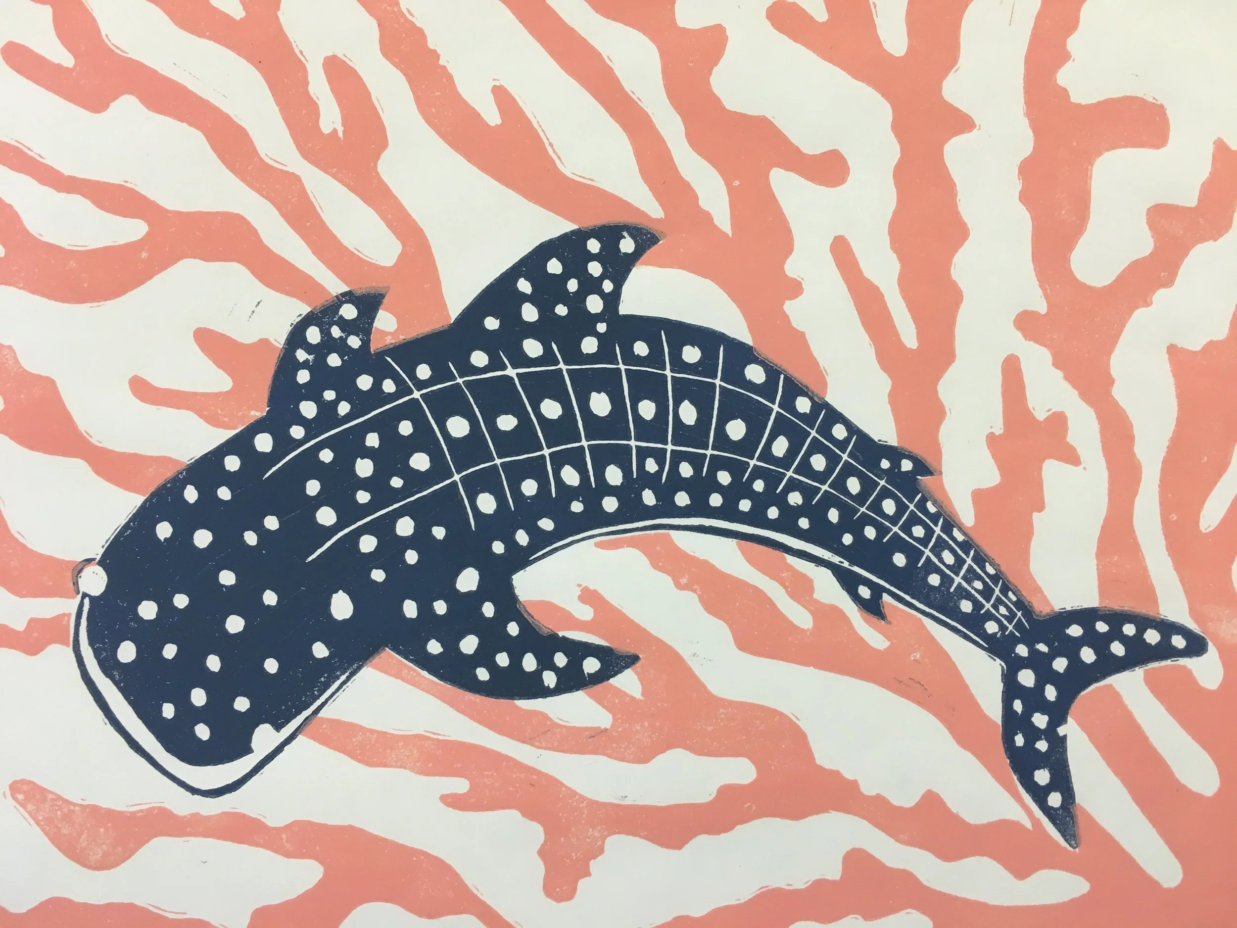 The whale shark in the foreground and the coral in the background were hand-carved onto two separate blocks in order to create a layered image.